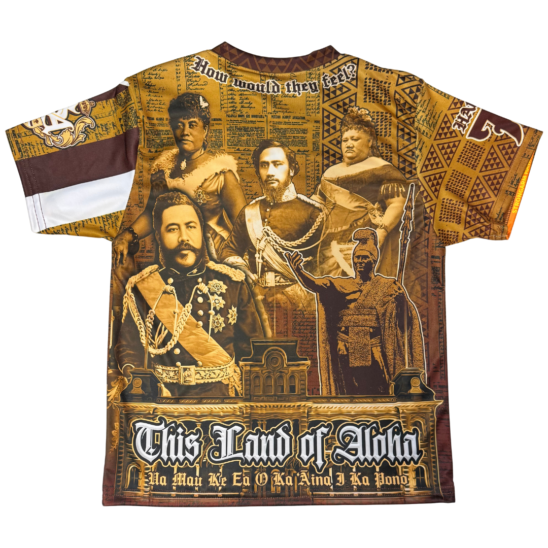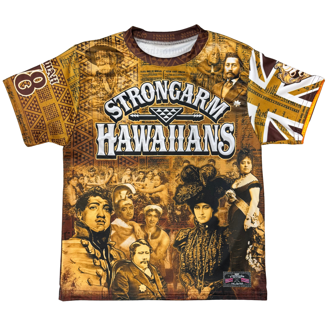 Strongarm Hawaiians How Would They Feel (Original) Sub Shirt features mōʻī and kūpuna of Hawaiʻi. In the background is Kūʻē Petitions against annexation. Hae Hawaiʻi and StrongArm logo on left sleeve. Hawaii 78 on right sleeve.