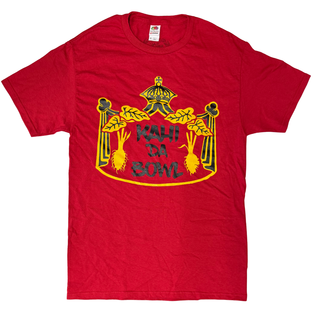 Strongarm Hawaiians Kahi Da Bowl Cotton T-Shirt features an old local saying, "Kahi da bowl."