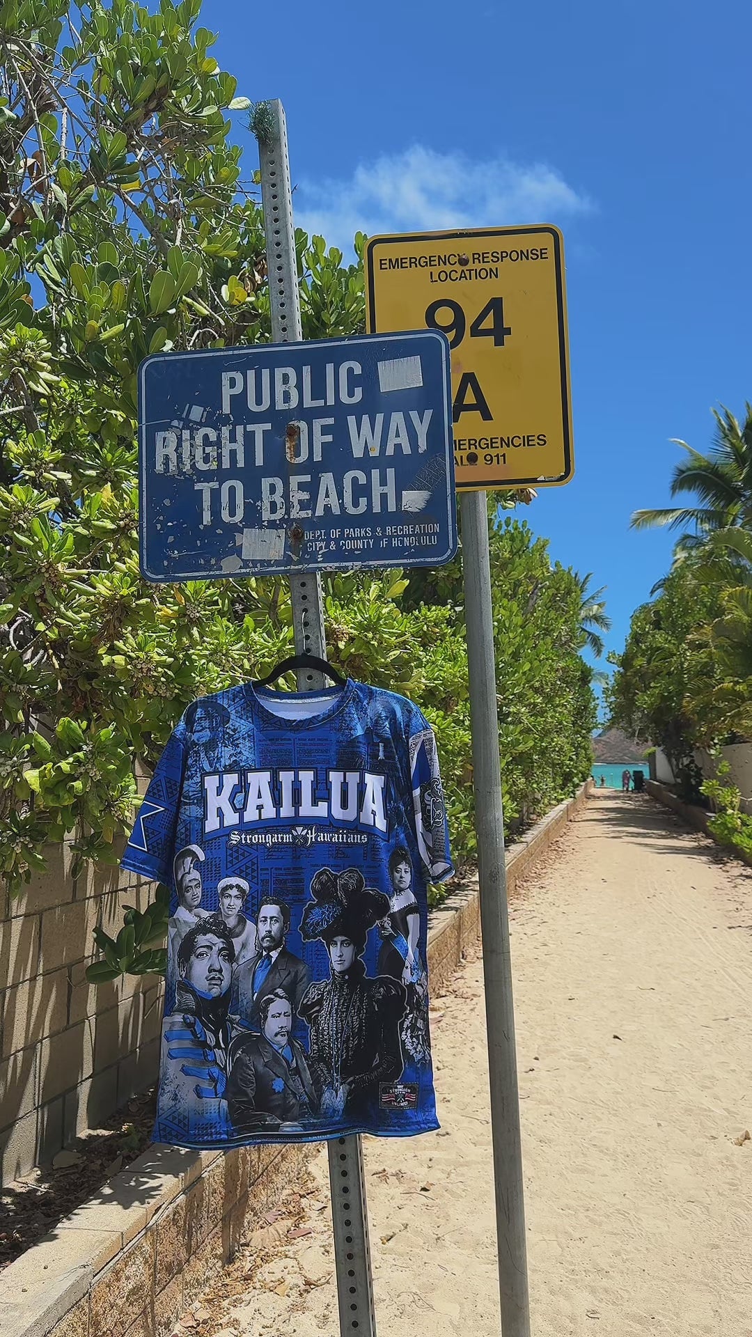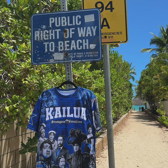 Strongarm Hawaiians Kailua - Sub Shirt featuring mōʻī and kūpuna of Hawaiʻi. In the background is Kūʻē Petitions against annexation. Hae Hawaiʻi on the left sleeve with the StrongArm logo. Kailua Surfriders logo with letter K and wave on the right sleeve.