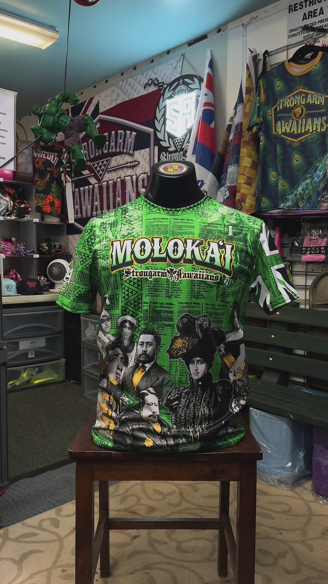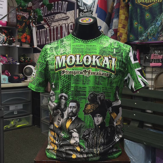 Strongarm Hawaiians Molokaʻi Sub Shirt features Hawaiians of the past with touches of gold atop the Kūʻē Petitions. With the names of the Hawaiian homesteads of Molokaʻi.