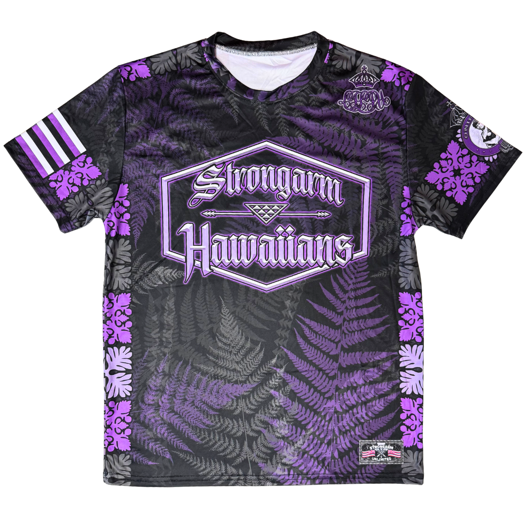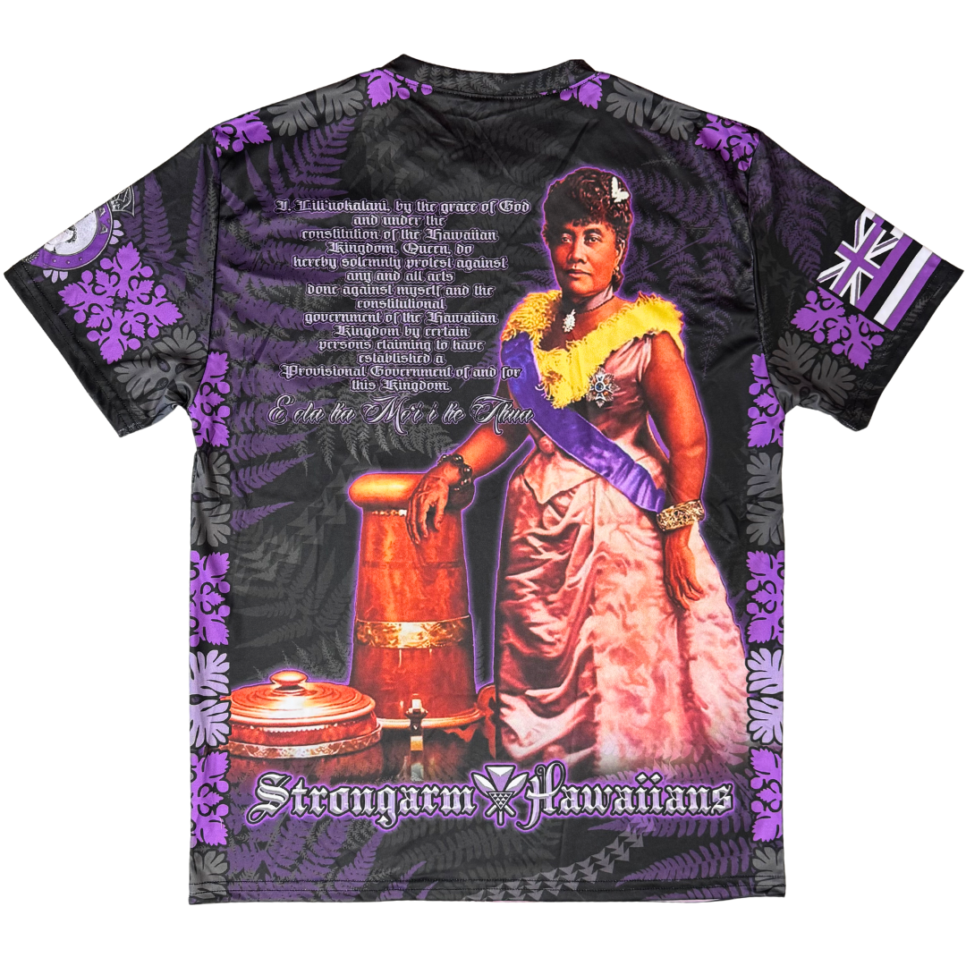 Strongarm Hawaiians Queen Liliʻuokalani Sub Shirt features a portrait of the Queen along with her statement against foreign occupation. Background design includes palapalai and Hawaiian flag on the sleeve. He inoa no Liliʻuokalani.