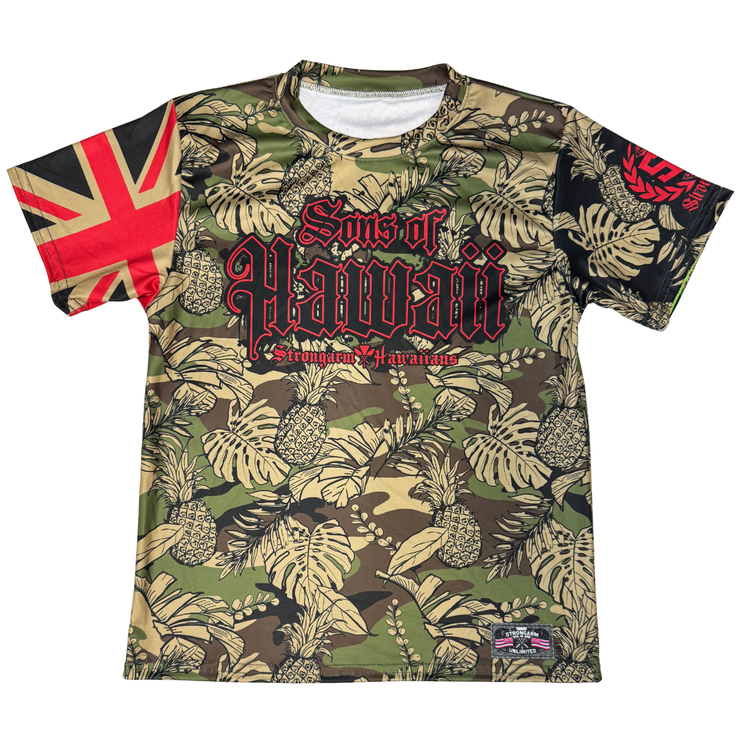 Strongarm Hawaiians Sons of Hawaiʻi Camo Pineapple - Sub Shirt with camoflage monstera, pineapple, and tropical foliage. Sons of Hawaii in black and red across the chest. Red StrongArm logo on left shoulder. Hae Hawaiʻi in red, black, and tan on the right shoulder.