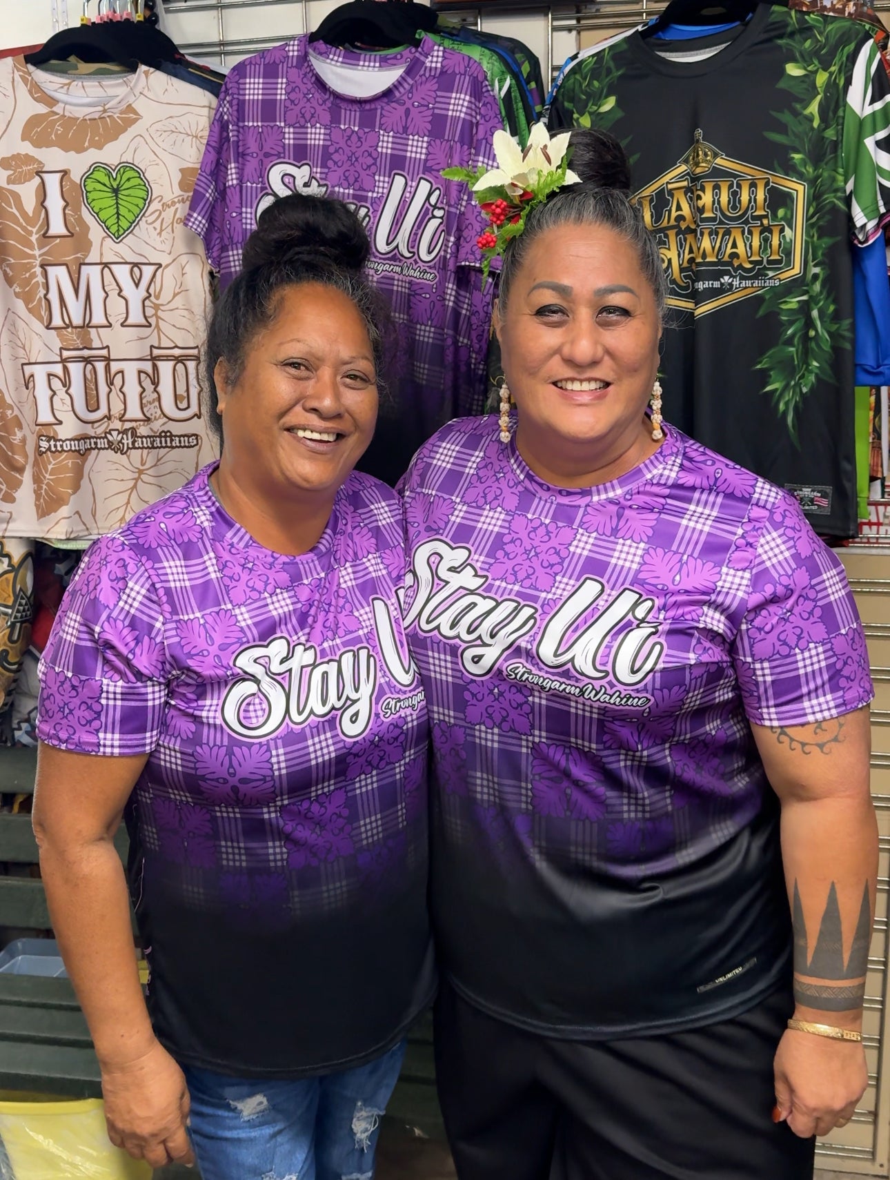 Strongarm Wahine Stay Uʻi Poni Palaka Sub Shirt features purple palaka and bird of paradise.
