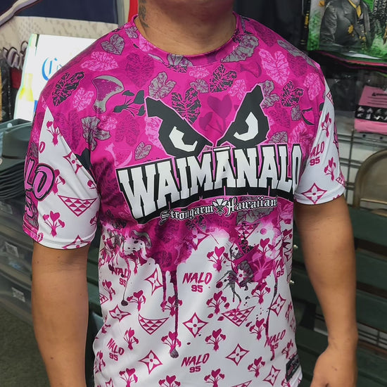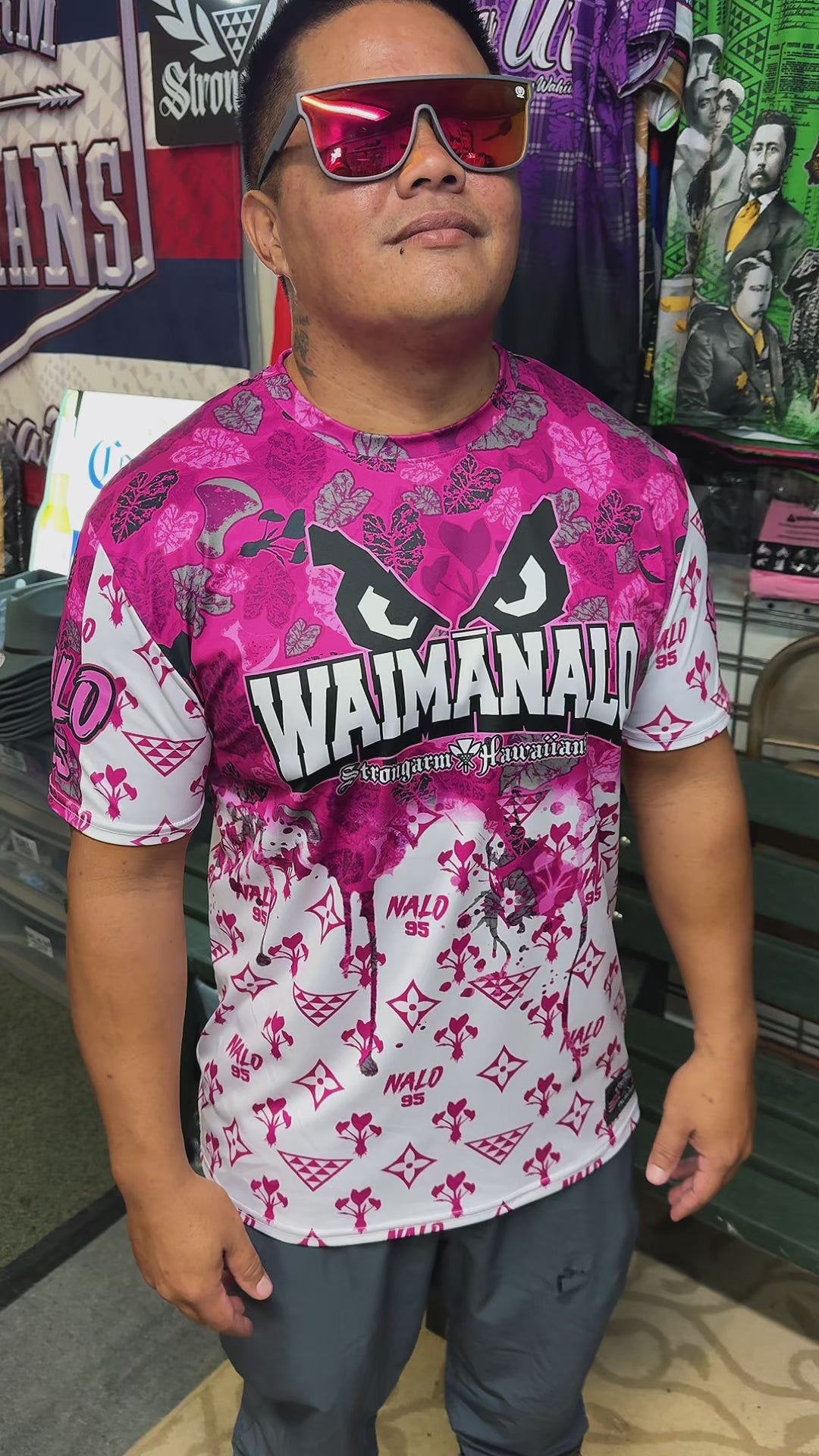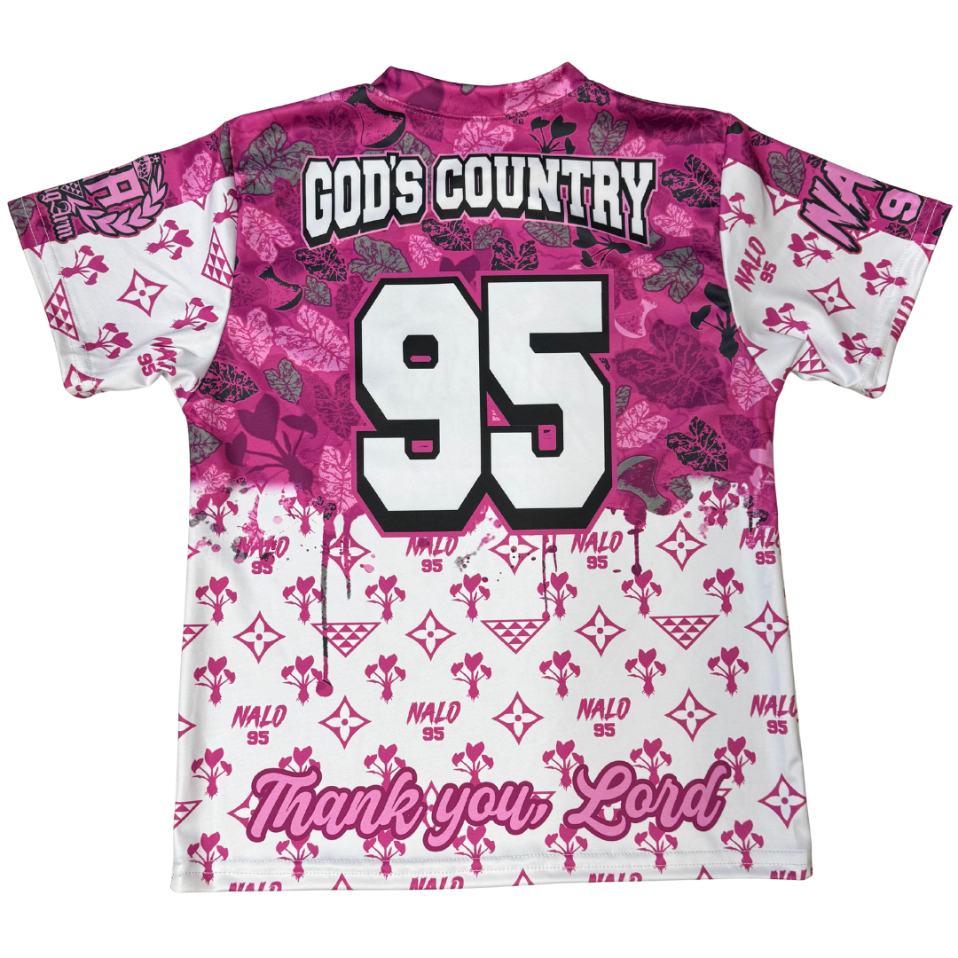 Strongarm Hawaiians Waimānalo "God's Country" ʻĀkala Kalo Sub Shirt features signature Strongarm Kalo Drip in a pink color way with bad boy eyes and luxury print. Back says "God's Country," the number 95, and "Thank you, Lord."